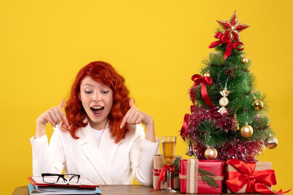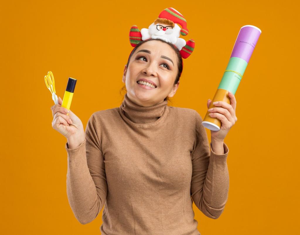 Biete Optionen in Stufen: Muss, Kann, Bonus. Zeige Beispiele. Betone, dass Kreativität vor Kosten geht. So entsteht Spielfreude statt Perfektionsangst, und wirklich jede Person fühlt sich willkommen und eingeladen.